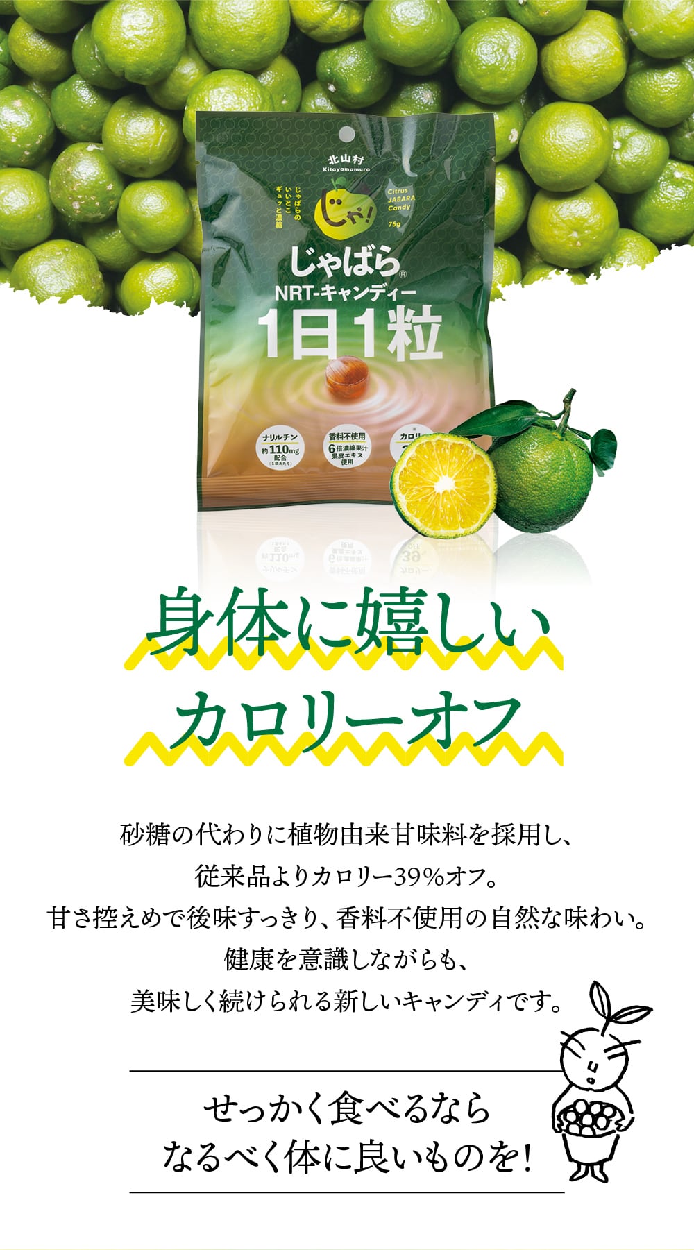 じゃばら果皮エキスと6倍濃縮果汁を使用したキャンディー。砂糖の替わりに植物由来の低カロリー甘味料を使用し、カロリー39%オフを実現。1粒あたり、約5.7mgのナリルチンを含有。