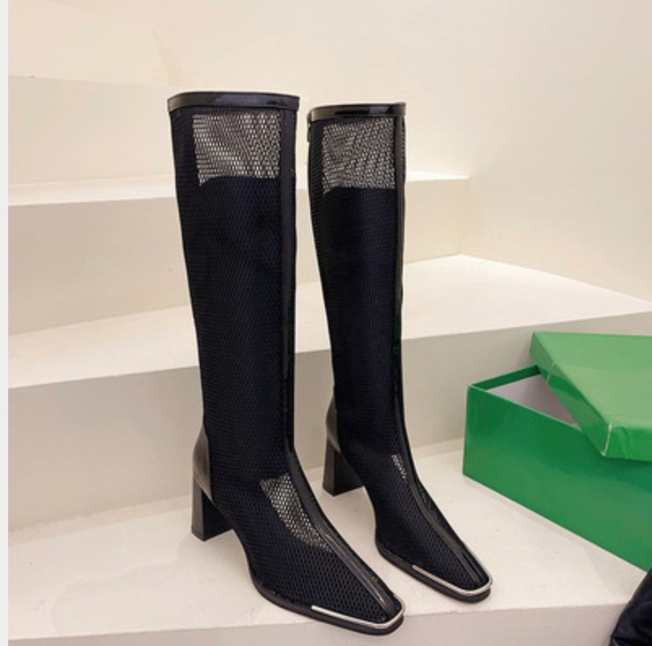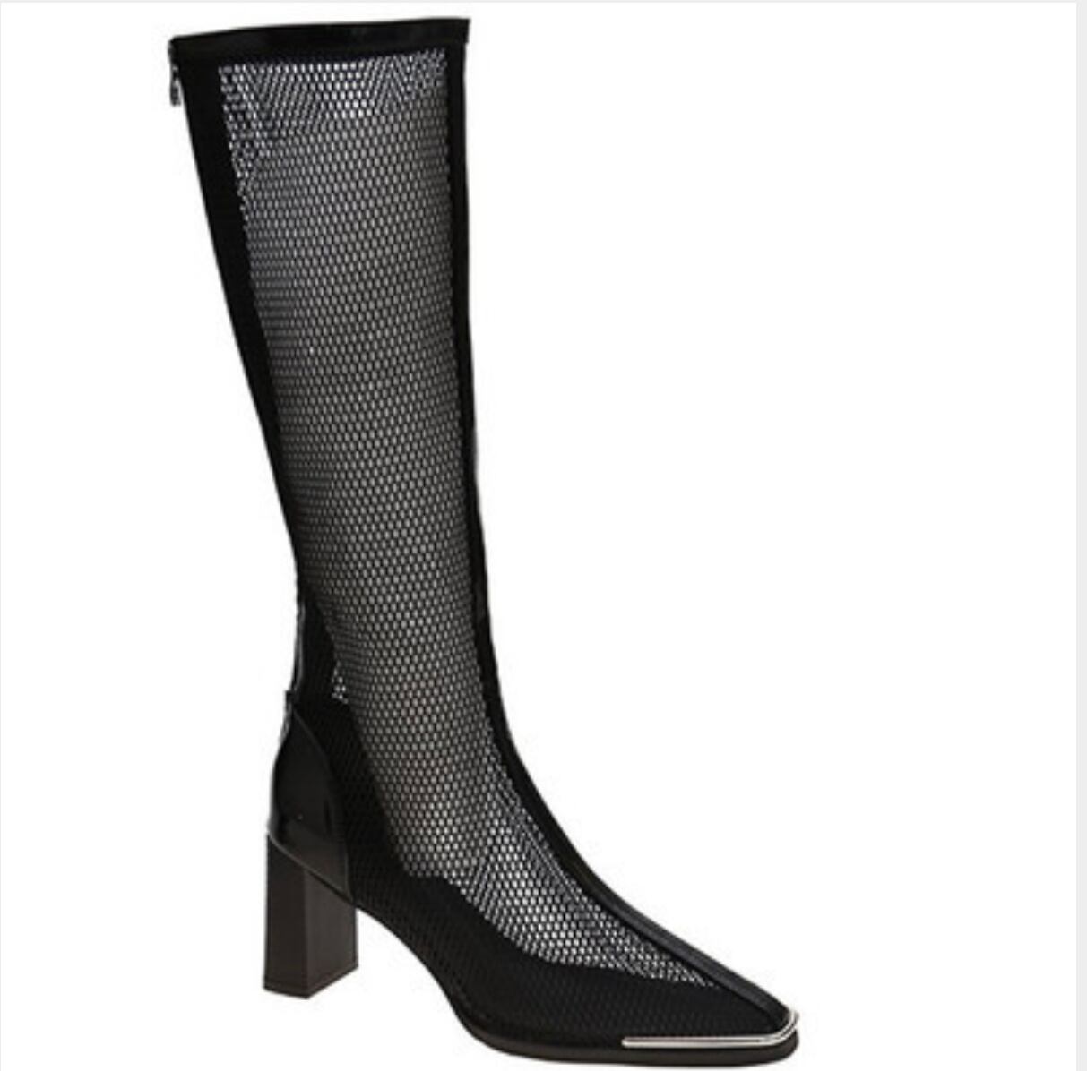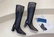 足首から膝上までしっかりと覆うメッシュ ロング ブーツ 黒。洗練されたデザインとブラックカラーが、どんなコーディネートにもスタイリッシュなアクセントをプラスしてくれます。