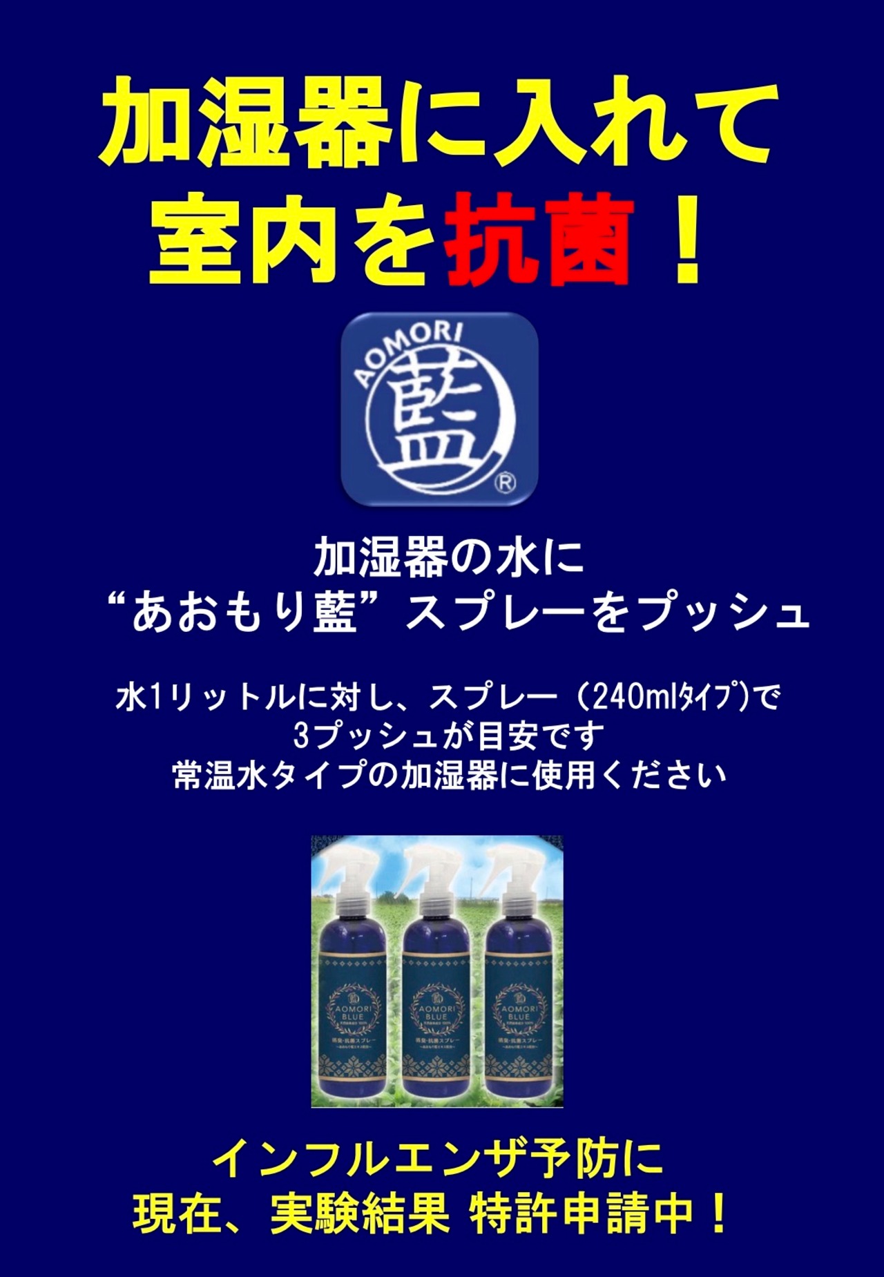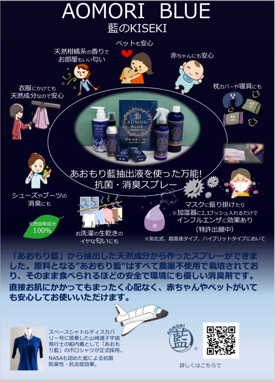 天然素材。ものづくり日本大賞東北経済産業局長賞受賞しました。 スペースシャトルディスカバリー号に搭乗した山崎直子宇宙飛行士の船内着として「あおもり藍」のポロシャツが正式採用。藍による抗菌防臭性・抗炎症効果が決め手でした。NASAも認めた、その高性能な「あおもり藍」から抽出した天然成分により多機能でご使用できるスプレー。原料となるあおもり藍はすべて農薬不使用で栽培されており、そのまま食べられるほどの安全で環境にも優しい抗菌消臭スプレーです。直接お肌にかかってもまったく心配なく、赤ちゃんやペットがいても安心してお使いいただけます。