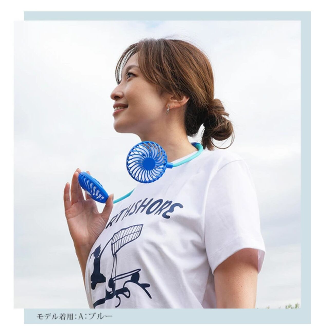首にかけるだけで涼しい、手で持つ必要のない 首掛け扇風機。両手が自由に使えるので